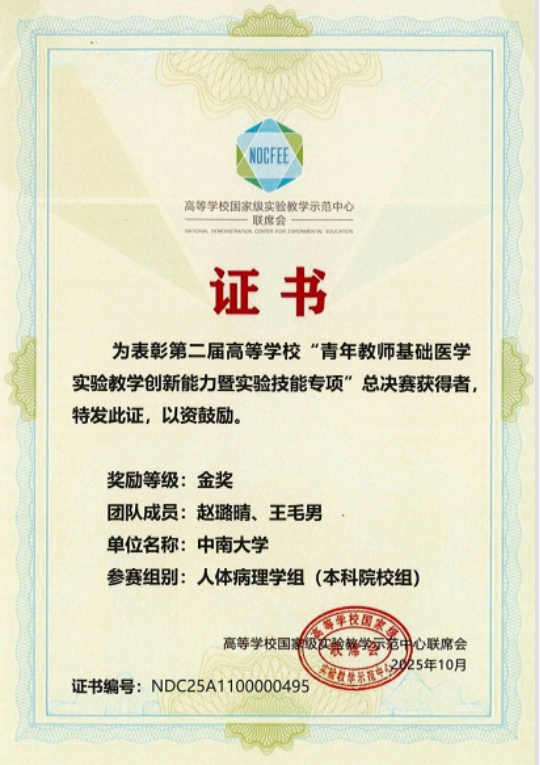 在本次赛事中,我们病理学系青年教师赵璐晴、王毛男团队代表学校参赛,在湘雅病理教学团队和教学主任胡永斌教授的精心指导下,凭借扎实的专业素养、精湛的实验技能和创新的教学设计,在众多参赛队伍中脱颖而出,荣获人体病理学组金奖。该团队在比赛中以高质量的教学展示、生动的课堂设计及科学严谨的实验操作,充分展现了湘雅教师的教学风采与创新能力,赢得了专家评委的一致好评。
